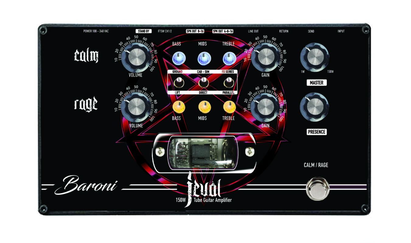 The Baroni JEVAL is a true 150-watt RMS Guitar Hybrid Amplifier that boasts a dual tube preamp section, featuring a hi-voltage ECC82 tube that enriches sound, dynamics and harmonic content, adding warmth and a huge bottom-end response typical of real tube Amplifiers. The Calm channel is designed to recreate the warmth and brilliance found in vintage amps of the “blackface” era, making it the perfect companion to your pedalboard. The Rage Channel is designed after our award-winning GURUS NINJA preamp pedal, which recreates the classic sound of ANGRIEST high-gain amplifiers. We have fully recreated the behaviour of a tube high-gain preamp section using a tube and a series of FETs configured to recreate up to six gain stages to obtain a huge amount of gain. Both channels have separate tone stacks. Separate Gain and Volume for each channel, plus Master Volume and master Presence, complete the palette of colours available to create your perfect sound.